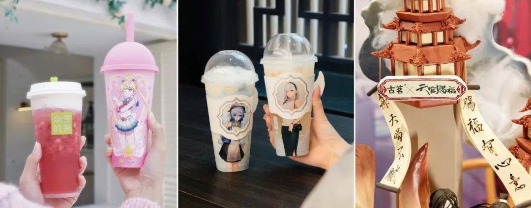 比如奈雪的茶联名《美少女战士》、喜茶联名《原神》《光与夜之恋》、古茗选择了《天官赐福》、茶百道联名《崩坏:星穹铁道》,瑞幸曾联名《哆啦A梦》《猫和老鼠》等,无一例外,这些联名最终都实现了引爆社交圈的效果。
