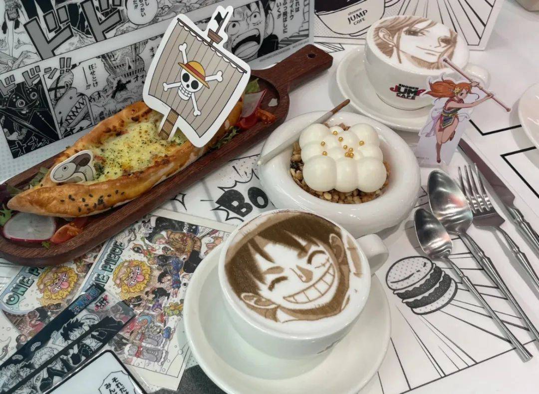 比如漫咖会推出与主题贴合的饮品。SHONEN JUMP CAFE不仅有动漫拉花咖啡,还复刻了二次元里的餐品,每次推新都是网友打卡晒照的C位。
