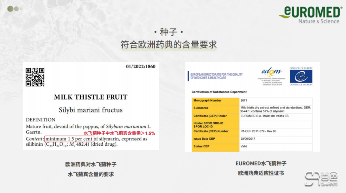 相较于其他的水飞蓟提取物,Ethis-094的质量优势,在还是一粒种子时就已经注定。依据《欧洲药典》对水飞蓟种子的规定,其内部的水飞蓟宾含量须大于1.5%,才符合要求。Ethis-094™的种子符合欧盟药典标准,也意味着Ethis-094™质量控制追溯到源头的承诺。