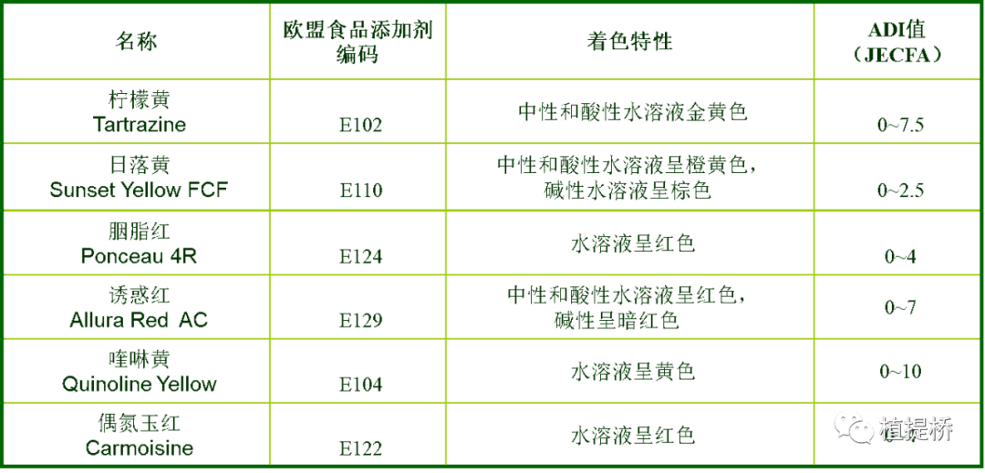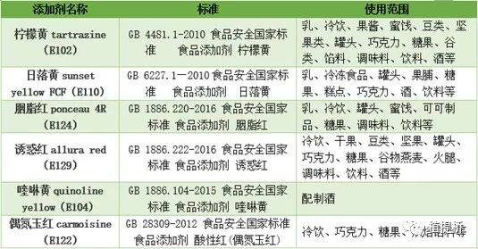 其中日落黄、诱惑红、柠檬黄、胭脂红等根据(GB 2760-2014)国家标准可以使用的范围很广泛,作为着色剂可在乳、冷冻食品、罐头、果脯、糖果、糕点、巧克力、酒、饮料等多种食品类型中添加。甚至在一些儿童食品中也能见到它们。