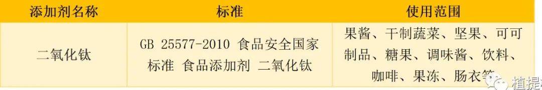 二氧化钛是目前允许使用的食品着色剂,同时它添加在涂层中也有避光的作用,它是用钛矿与硫酸等为原料制备的食品添加剂。目前依据国家执行标准(GB 25577-1010)可以应用于果酱、可可制品、饮料、咖啡、果冻、肠衣等多种食品类型中。