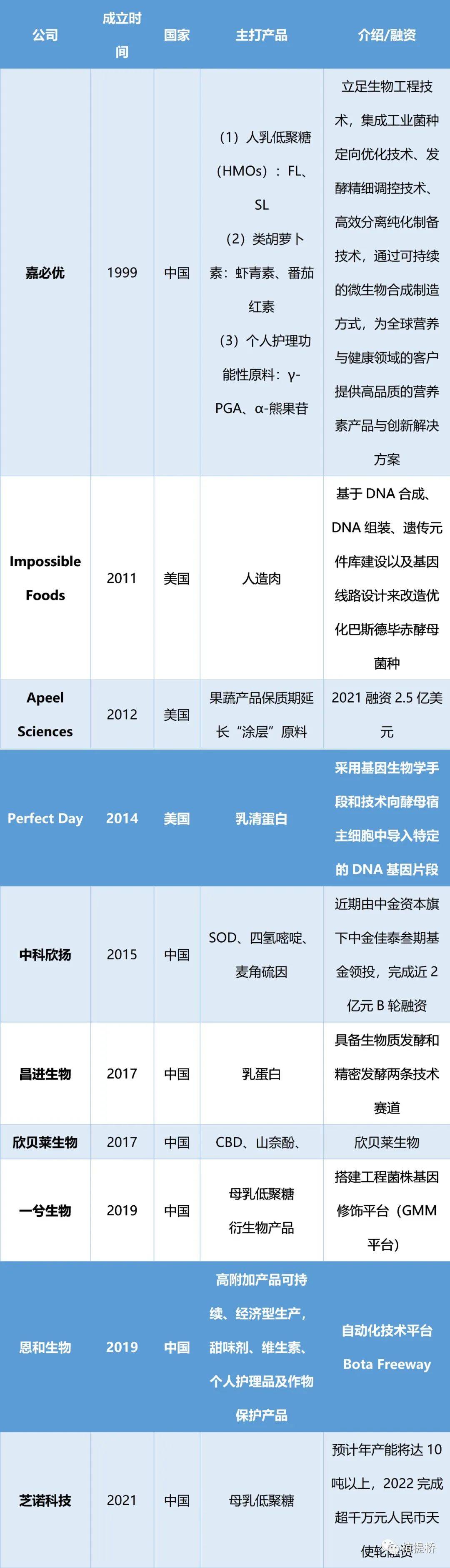 以下是全球合成生物学食品营养赛道部分代表企业(按照时间排序),信息来源于公开信息和公司官网整理。