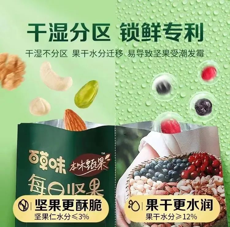 本味甄果系列在包装上做到双重锁鲜。袋装产品使用双层铝箔包装(市面上多为单层镀铝包装),增加包装的隔氧性和阻光率;且使用百草味拥有专利的锁鲜分区技术,保障坚果仁水分≤3%(市面上坚果水分多为3-6%),果干的水分≥12%。
