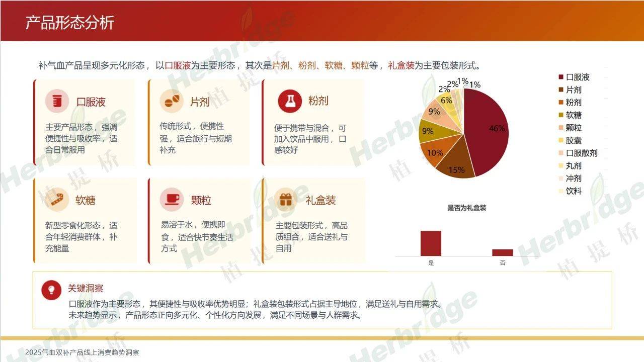 以口服液为主要形态,其次是片剂、粉剂、软糖、颗粒等,礼盒装成为主流包装形式。