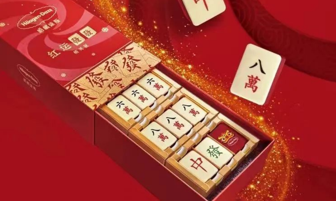 哈根达斯将中国的传统娱乐活动融进冰淇淋造型,在春节期间推出“红运发发”精英版礼盒,外形精致小巧的12枚“麻将”由5种不同口味的冰淇淋组合而成,分别印有“六萬”、“八萬”、“中”、“發”和“虎头”,寓意开局必赢,谁看了不惊呼一声“会玩”!