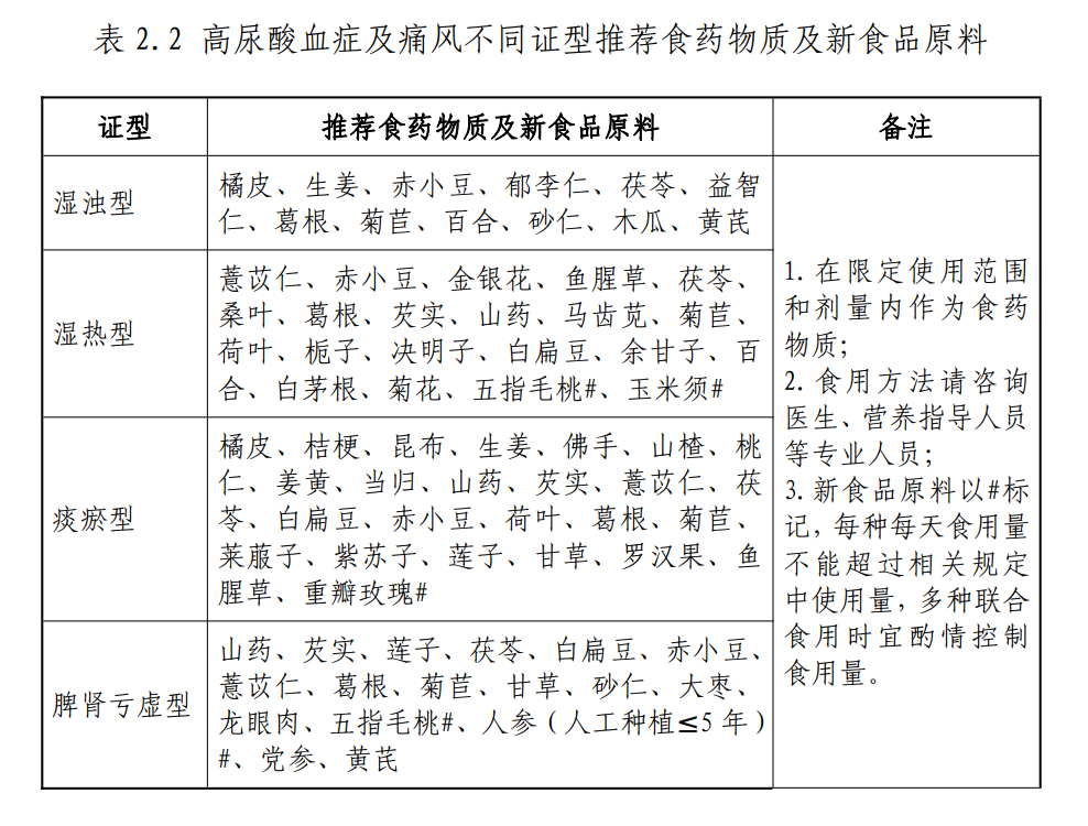 表:高尿酸不同证型推荐食药物质及新食品原料