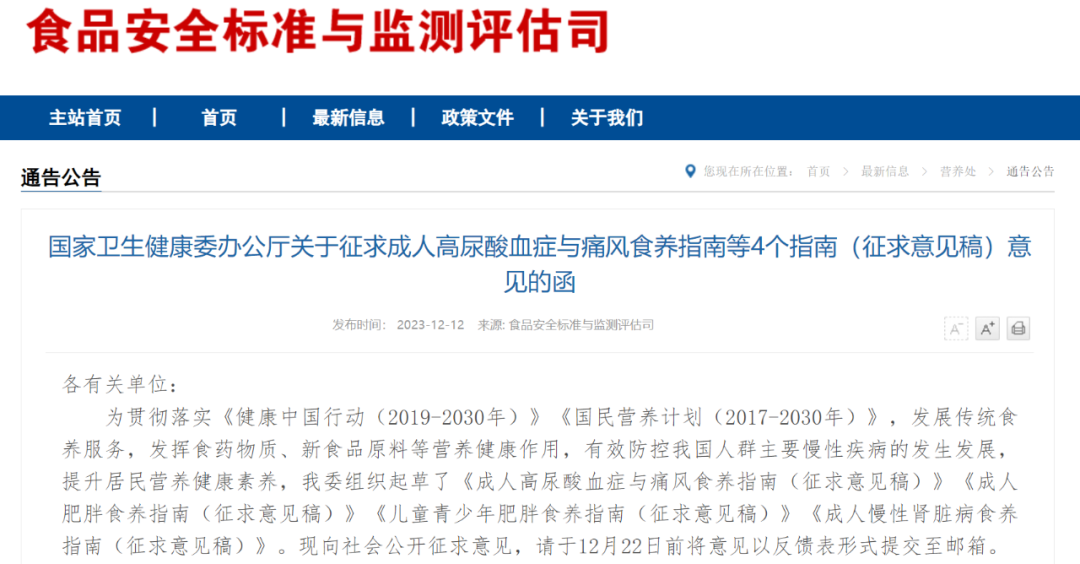 12月12日,国家食品安全标准与监测评估司发布了4个征求意见及编制说明,分别是成人高尿酸血症与痛风食养指南(征求意见稿)、成人肥胖食养指南(征求意见稿)、儿童青少年肥胖食养指南(征求意见稿)、以及成人慢性肾脏病食养指南(征求意见稿); 面向社会征求意见,意见截止反馈日期为12月22日。