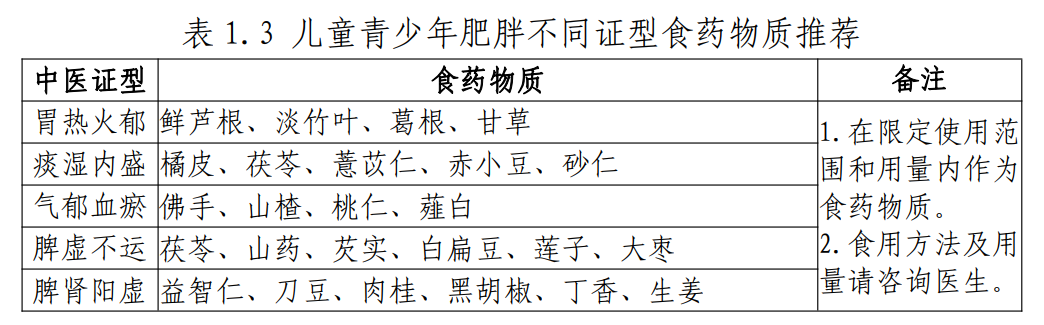 表:儿童青少年肥胖不同证型食药物质推荐