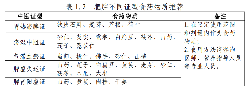 成人肥胖食养指南(征求意见稿)给出疾病分型、食物调理推荐外,还根据肥胖证型给出食药物质推荐。