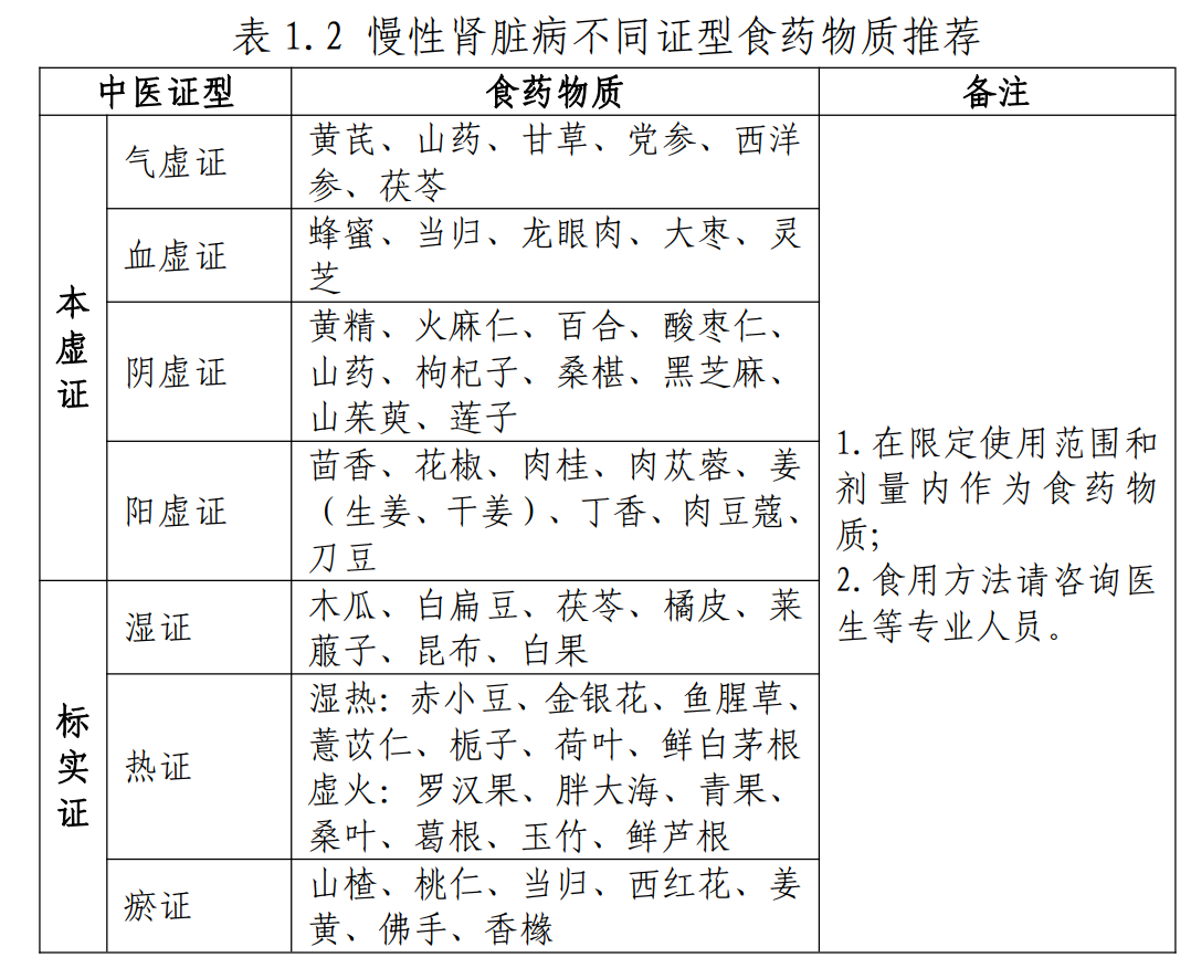 表:慢性肾病不同证候食药物质推荐