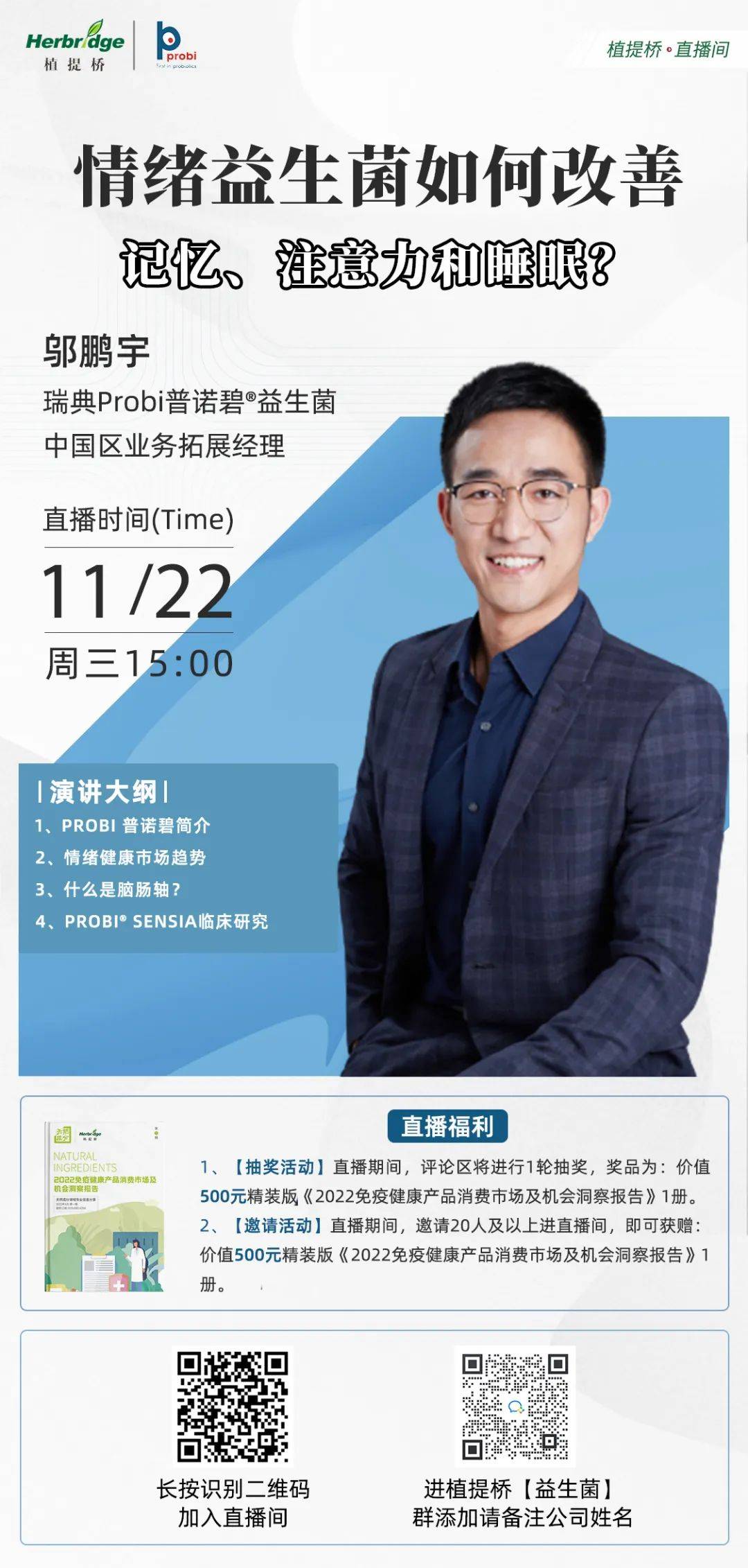 11月22日下午15:00,Probi普诺碧®中国区业务拓展经理邬鹏宇将在植提桥线上会议开展情绪管理公开课,围绕情绪益生菌如何影响记忆、注意力和睡眠等进行分享。