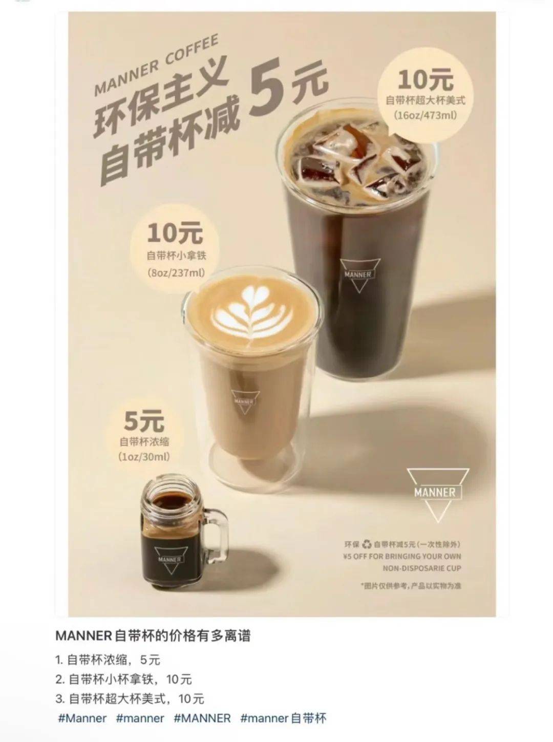 大致内容是:Manner自带杯浓缩5元、自带杯小杯拿铁10元,自带杯超大杯美式10元。
