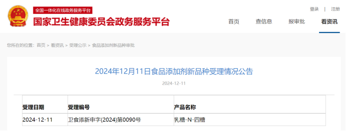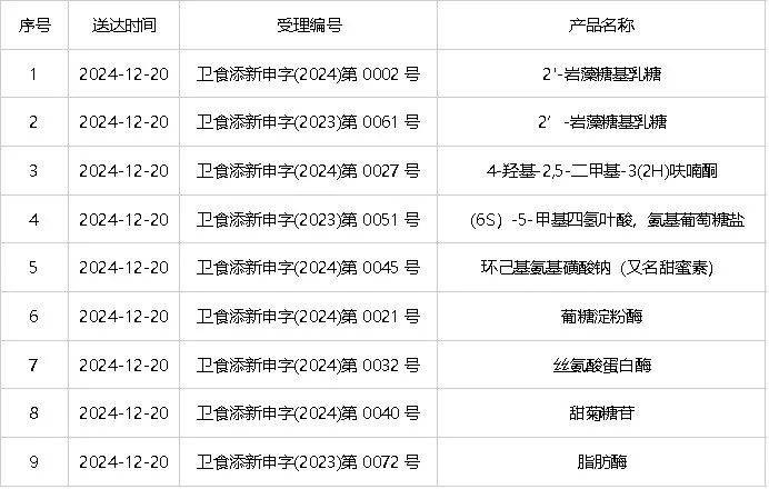 表:2024年12月10日食品添加剂新品种受理情况公告