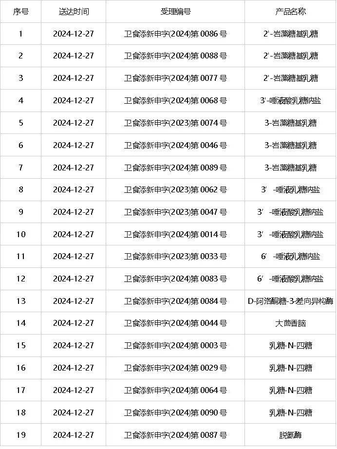 年末冲“业绩”,‘三新原料’审批加速,2024年HMOs多种成分申报是热点,官方也加快了审批的步伐。