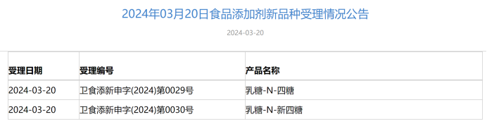 据植提桥统计,目前乳糖-N-四糖被受理2次,乳糖-N-新四糖也被受理了2次申报,而且乳糖-N-新四糖与2023年第8号公告《关于桃胶等15种“三新食品”的公告》已经获批食品添加剂新品种。