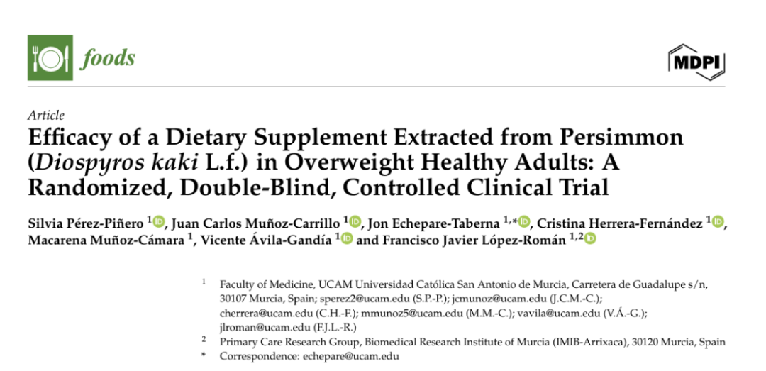 3、Pérez-Piñero S, Muñoz-Carrillo JC, Echepare-Taberna J, et al. Efficacy of a Dietary Supplement Extracted from Persimmon (Diospyros kaki L.f.) in Overweight Healthy Adults: A Randomized, Double-Blind, Controlled Clinical Trial. Foods. 2024;13(24):4072. Published 2024 Dec 17. doi:10.3390/foods13244072