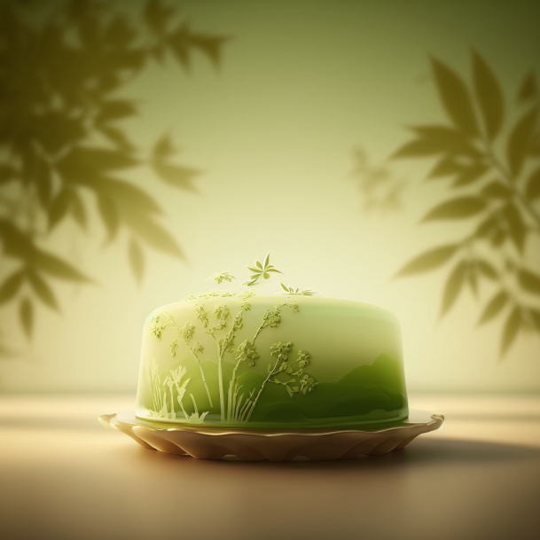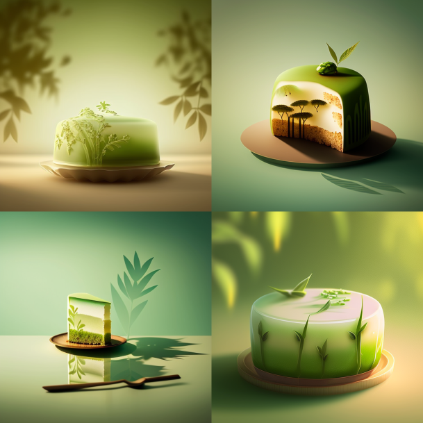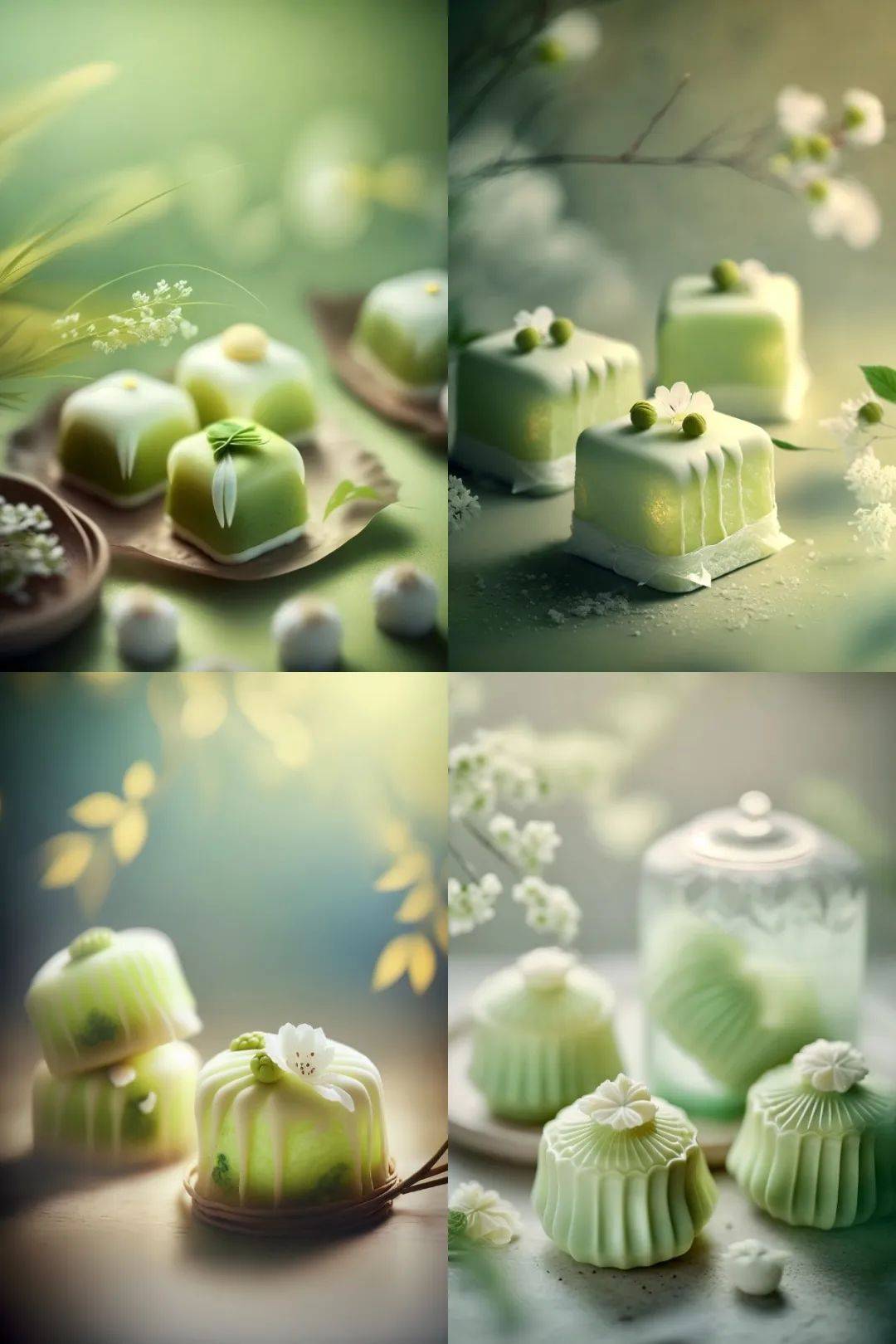 Midjourney完美地融合食物和光影,晨光落在青绿色的蛋糕上,给人以清新静谧之感。