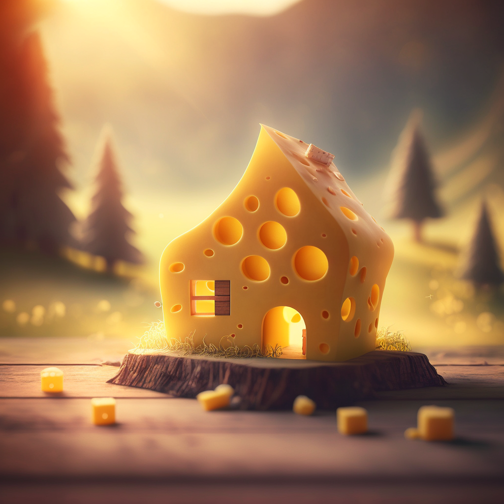 奶酪世界怎么能没有可爱的奶酪小房子呢!奶酪小房子坐落在小山坡上,阳光洒落,让整体画面看起来更加丰富自然。