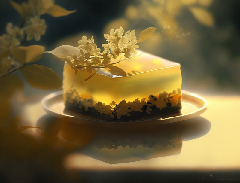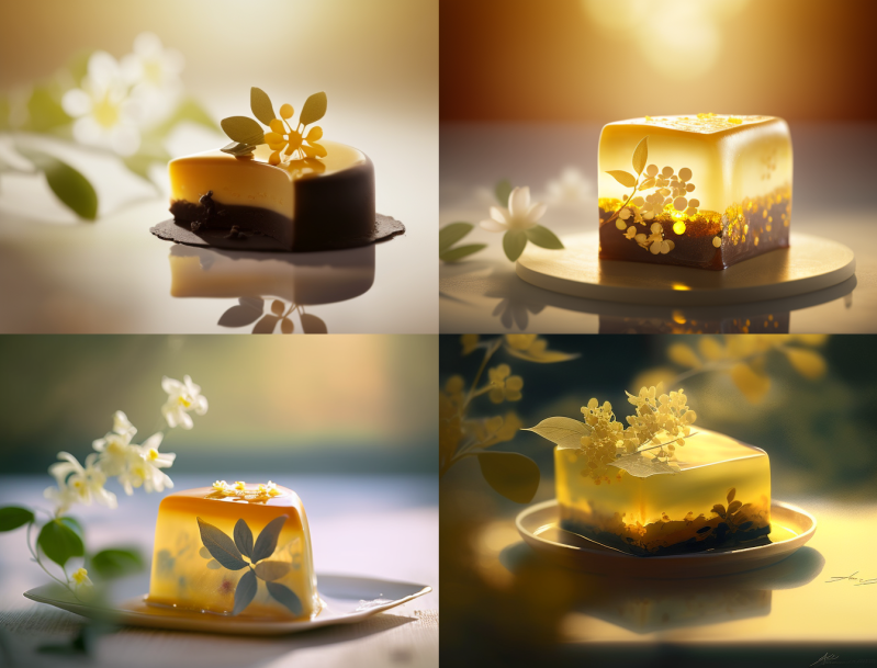 Midjourney果然不负众望,温暖的画面带着馥郁的桂花香气,这块小小糕点的配方中似乎也被悄悄地加入了一勺秋日阳光。