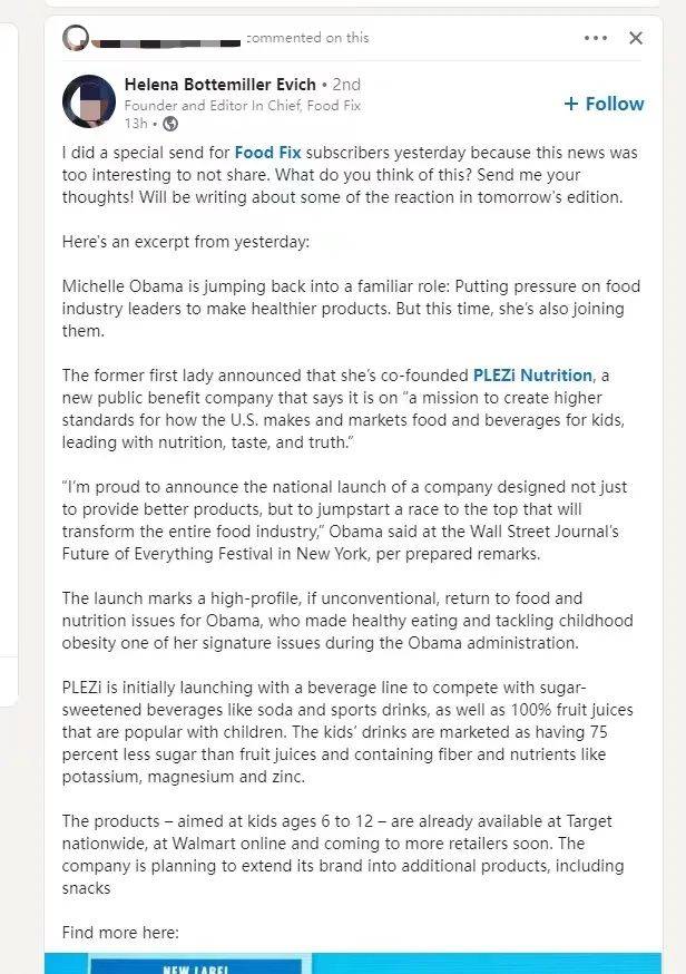Food Fix创始人兼主编Helena对该事件发表观点,同时她在社交媒体上引用了报道原文,“米歇尔·奥巴马又跳回到了一个熟悉的角色:向食品行业的领导者们施加压力,促使他们生产更健康的产品。但是这一次,她也加入到了食品行业的领导者中。”