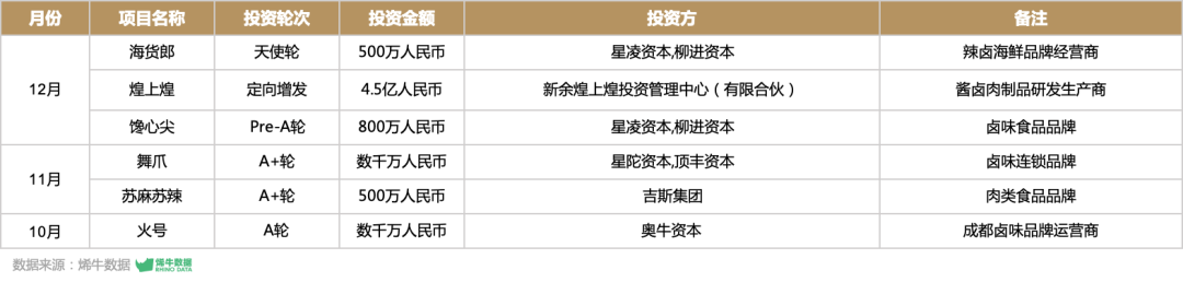 12月,卤味食品品牌「馋心尖」获得了来自星凌资本和柳进创投的800万元Pre-A投资,这是馋心尖在2022年获得的第二笔融资。年初1月,馋心尖获得了来自道合鼎盛和铭君创投的300万元天使轮融资。此外,传统卤味巨头「煌上煌」也在本月募资4.5亿,用于企业肉鸭屠宰及副产物项目、酱卤食品加工项目及食品加工及冷链项目。