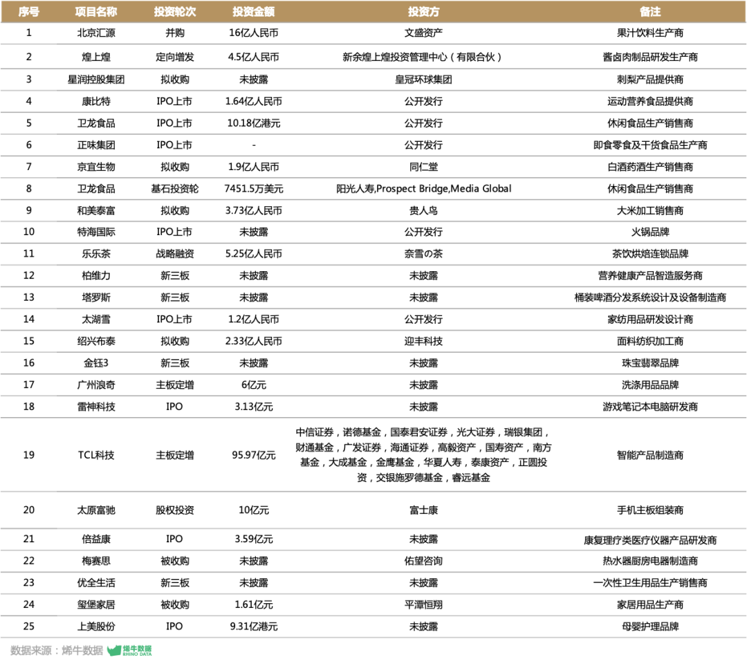 本月共有20起过亿元投融资(含IPO),主要集中在食品饮料、消费科技于电商零售领域。其中,休闲食品生产销售商「卫龙食品」在本月成功冲刺港股IPO,并与分众传媒旗下Media Global Management Limited、阳光人寿保险及Prospect Bridge订立7451.5万美元基石投资协议,成为名副其实的“辣条一哥”。