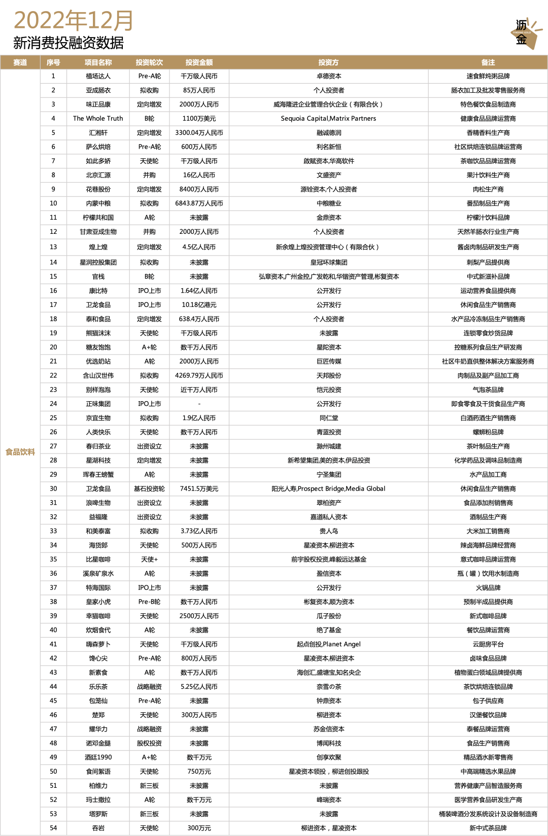此外,12月也见证了不少优秀餐饮食品企业的资本化之路。海底捞海外业务子公司「特海国际」在港交所介绍上市,即食零食及干货食品生产商「正味集团」通过港交所上市聆讯并披露了聆讯后招股书。随着国家防疫“新10条”的推出,各界对餐饮业的复苏充满期待,以港股上市为契机,亦可助企业拥有更多的战略灵活性,期冀借力资本市场实现跨越式的发展。