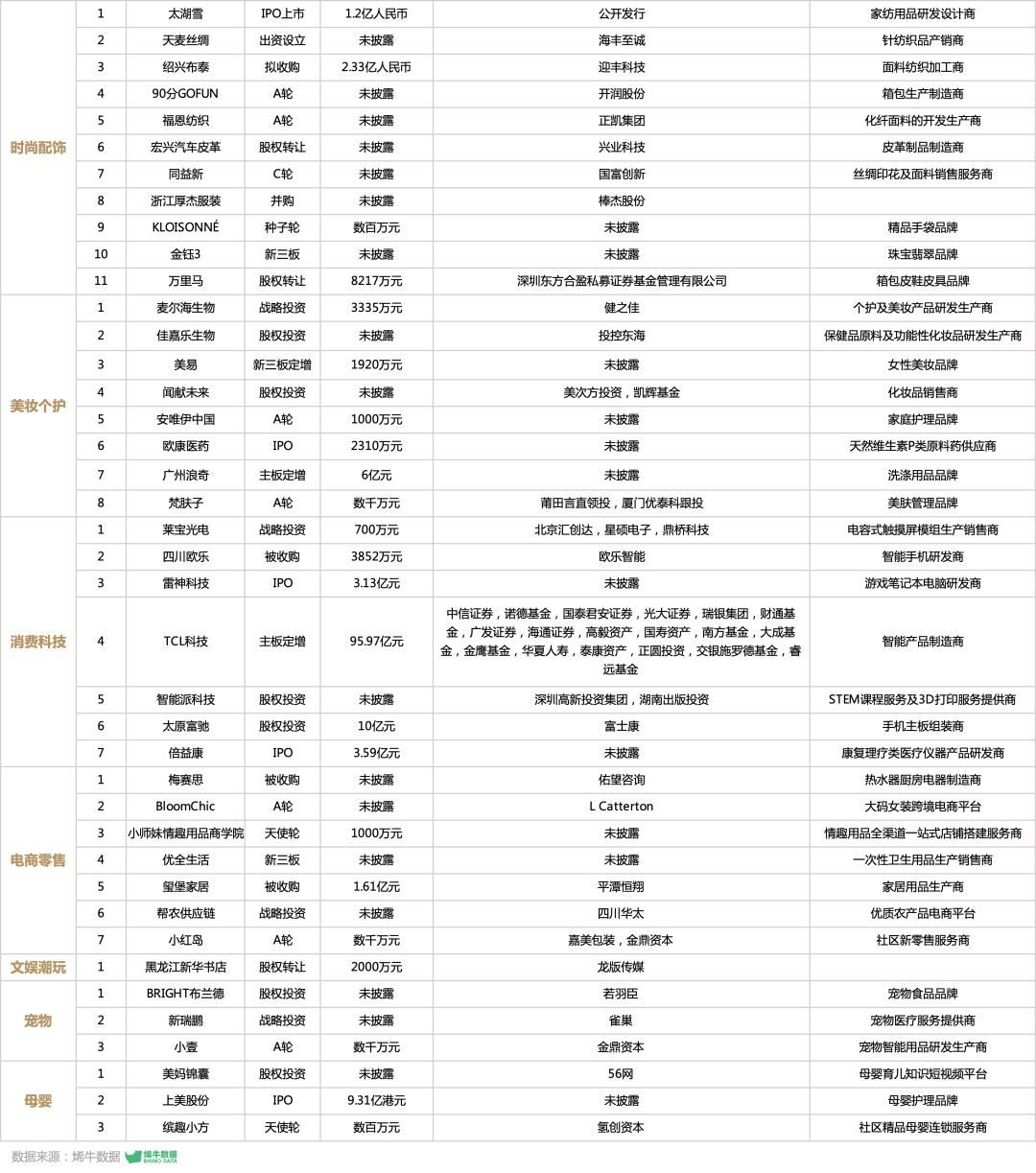 此外,选择在本月上市的企业数量相当可观,IPO事件达10起,5家企业登陆新三板。作为本月金额规模最大的一笔IPO,国货美妆与母婴护理品牌「上美股份」在香港交易所敲钟上市,成为“港股国货美妆第一股”。