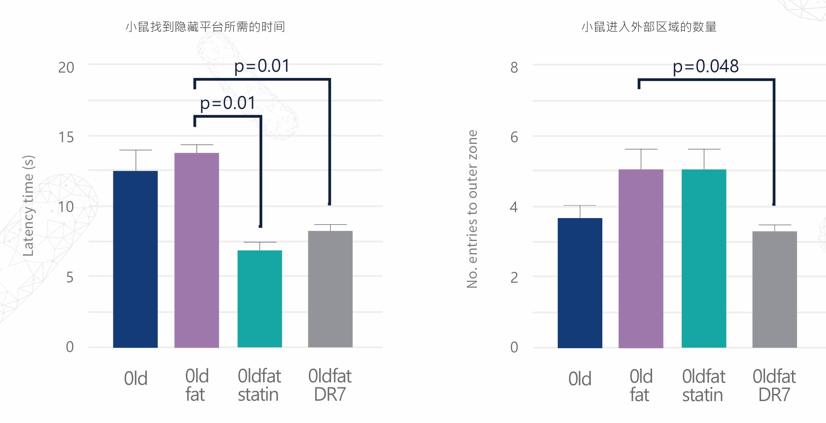 左图:植物乳杆菌 DR7 提升年老和超重鼠对泳池中隐藏平台位置的记忆力,达到与幼鼠相等的水平