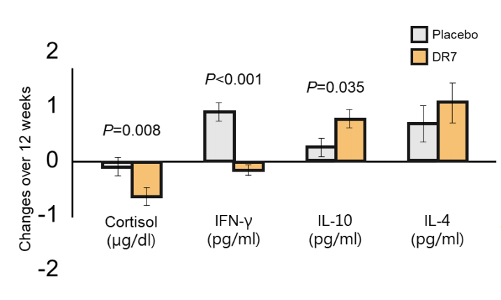 Cortisol为人体的压力荷尔蒙,12周后,使用DR7的组别其Cortisol显著下降;IFN-γ为促发炎反应之细胞因子,会加速身体老化反应,12周后,使用DR7的组别其IFN-γ显著下降;IL-10、IL-4为抗发炎反应之白介素,12周后,使用DR7的组别皆显著增加。