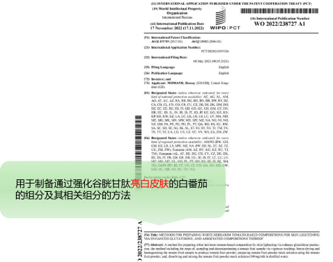 (专利号WO2022238727,Method for preparing white heirloom tomato-based compositions for skin lightening via enhanced glutathione, and associated compositions thereof)