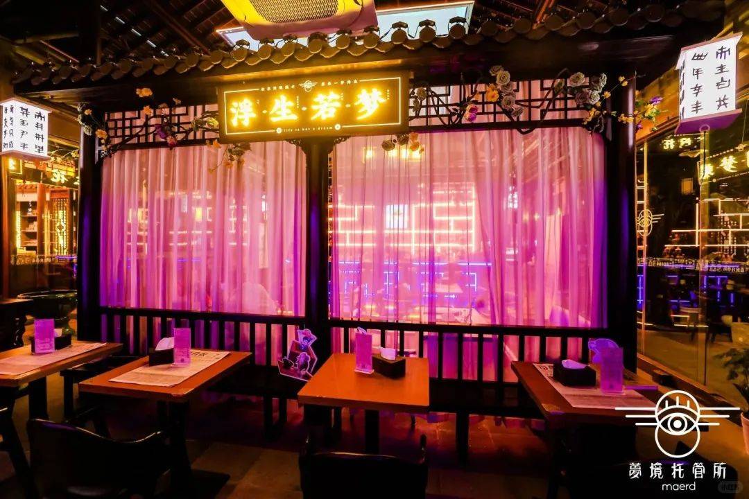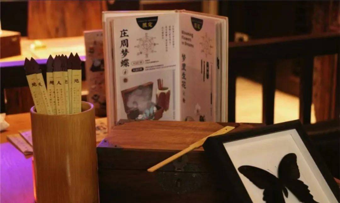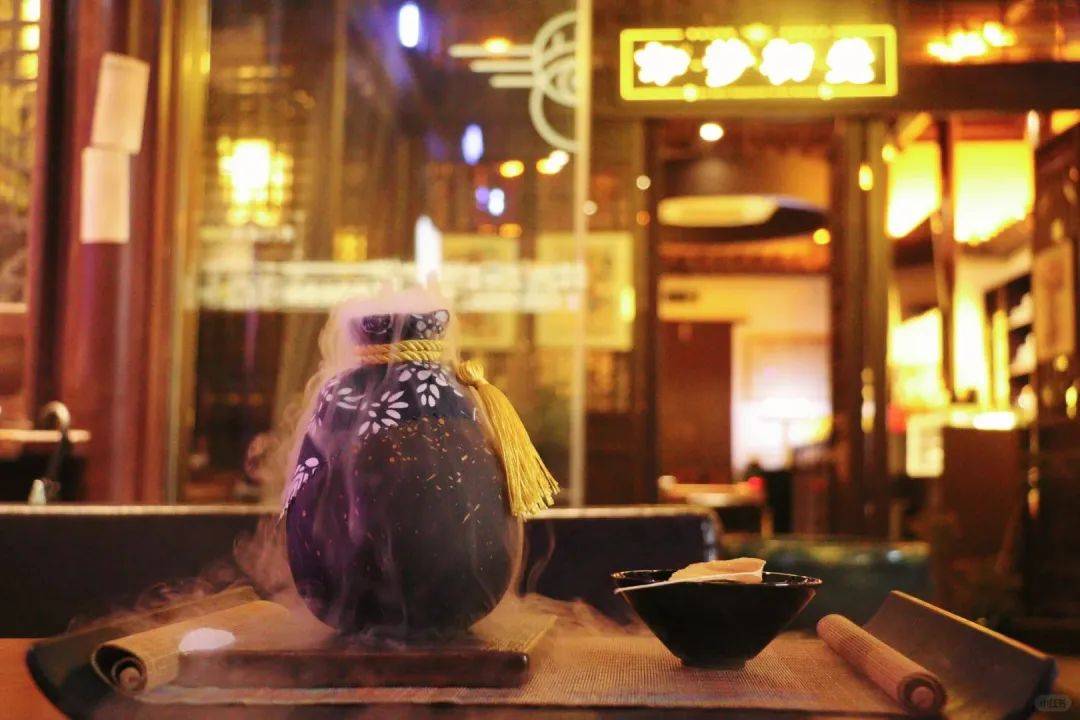走进店内,各种神秘符号、木质家具、庙宇式酒塔吧台等,都散发出古老神秘的气息,瓷器、书画等装饰的每一处细节,让人感觉“下一秒就要穿越”。