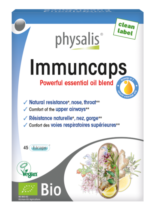 比利时食品补充剂生产商KeyPharm Laboratories推出的这款Physalis Immuncaps营养补充剂主要以植物精油为主,包括桉油樟精油、窄叶薄荷精油、迷迭香精油、生姜精油和山香薄荷精油等,主要的消费场景集中在免疫支持方向,同时在呼吸道方面有一定应用潜力。