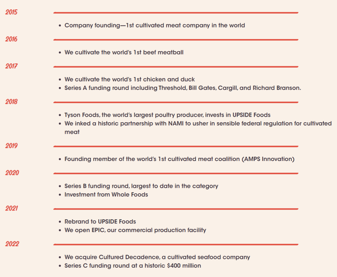 Upside Foods 成立于 2015 年,公司前身名字为Memphis Meats,该公司在2016年2月发布了世界上第一个细胞培养肉丸,在2017年3月发布了世界上第一个细胞培养家禽肉,在细胞培养肉方向有相对深厚的积累。