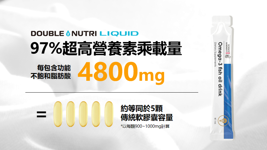 该实验结果充分说明了Double Nutri Liquid技术在提高鱼油生物利用率方面表现出的绝对优势,同时让该产品以食用一包媲美26颗传统软胶囊的超强功效建立起了坚实的市场壁垒。