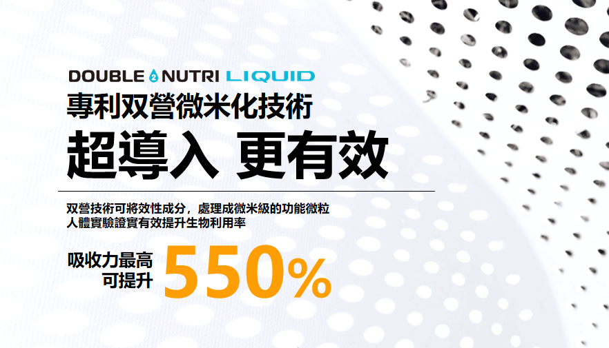 根据了解,Double Nutri Liquid是由大江生医TCI研发的脂质体包覆技术,它能够将乳化成分、天然植物胶体及功能性成分结合在一起,并将功效成分均质化为能够被人体快速吸收利用的微米级颗粒,即特殊的脂质体liposomal。这种脂质体具有比传统脂质体更高的包封率和更好的稳定性,可高度稳定地包裹油、水相甚至难溶离子的营养效性物,保持成分的稳定性,同时降低营养素、萃取物中的不良风味。