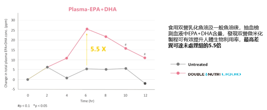 这一数据也通过Double Nutri Liquid技术的人体试验得到了证实。根据大江生医TCI专业研发团队针对4位健康受试人所进行的鱼油吸收率评估试验显示,经Double Nutri Liquid技术乳化后的鱼油相较未经处理的在人体内吸收效果更好,两者血液中的EPA+DHA含量对比最高差异可达5.5倍。