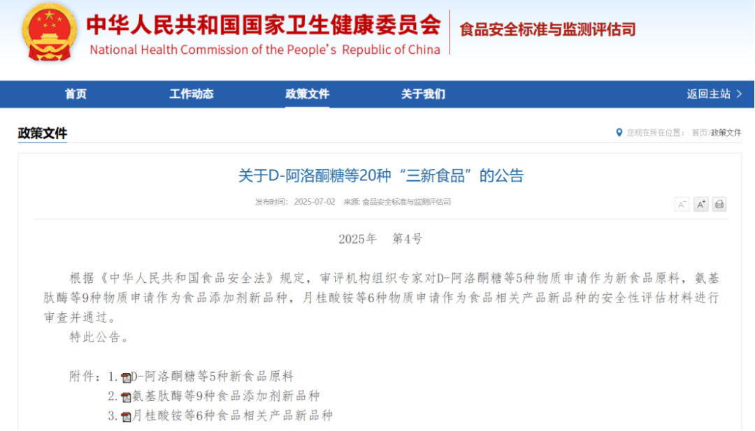 2025年7月2日,国家卫生健康委、国家市场监督管理总局发布 2025 年第 4 号公告,批准D-阿洛酮糖等5 种新食品原料,氨基肽酶等9 种食品添加剂新品种