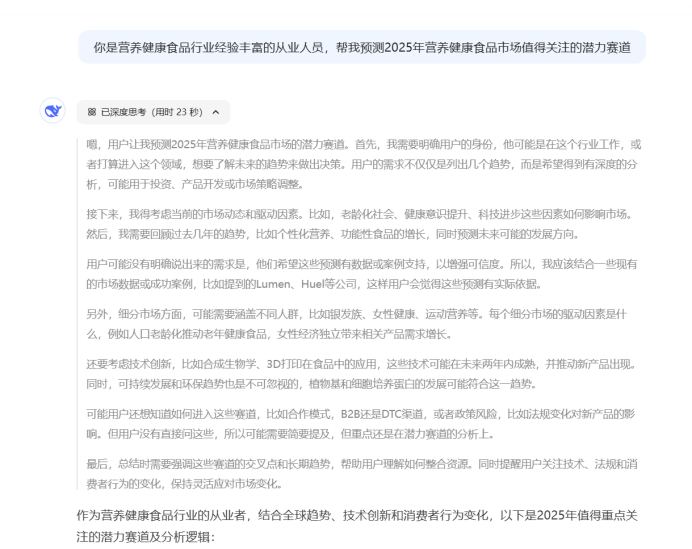 2025年春节期间,DeepSeek爆火,当我问DeepSeek2025年营养健康食品市场值得关注的潜力赛道时,它在深度思考23秒后,给出了以下回答。本文章内容在DeepSeek回答的基础上有简单编辑删减。