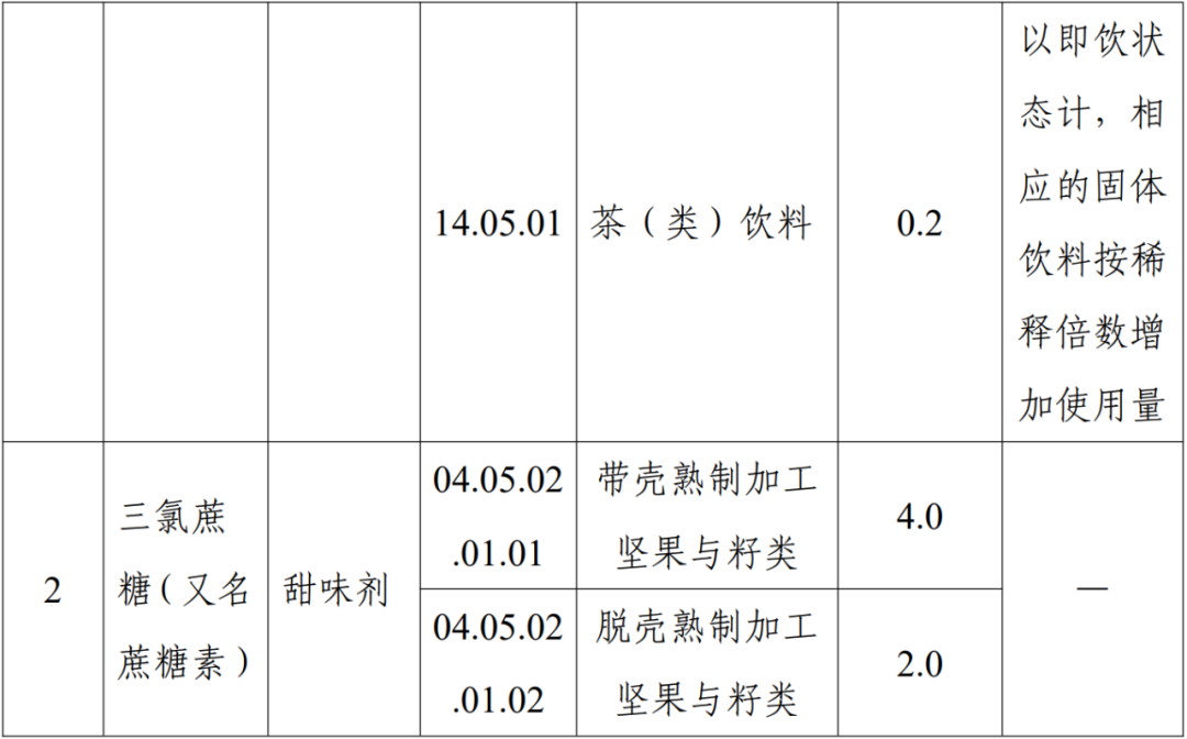 三氯蔗糖作为甜味剂已列入《食品安全 4 国家标准 食品添加剂使用标准》(GB 2760),允许用于风味发酵乳、冷冻饮品、加工坚果与籽类、糖果、焙烤食品等食品类别,本次申请在带壳熟制加工坚果与籽类(食品类别 04.05.02.01.01)中最大使用量由1.0 g/kg 扩大到4.0g/kg , 在 脱 壳 熟 制 加 工 坚果与籽类(食品类别04.05.02.01.02)中最大使用量由1.0 g/kg 扩大到2.0g/kg。
