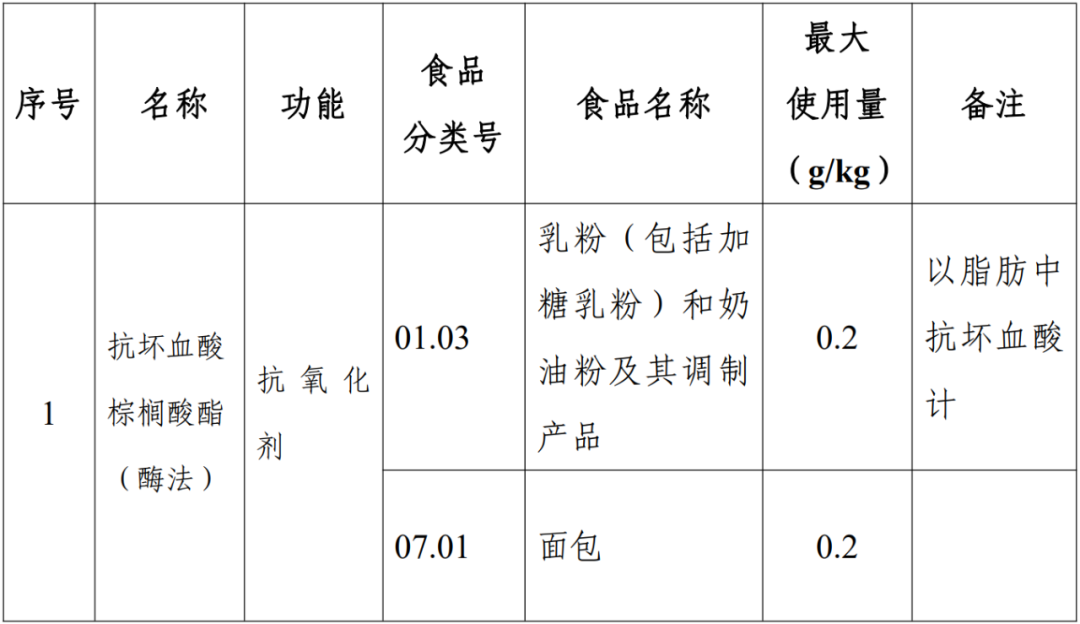 1.背景资料。抗坏血酸棕榈酸酯(酶法)于2016年第9 号公告批准作为抗氧化剂用于脂肪,油和乳化脂肪制品等食品类别。