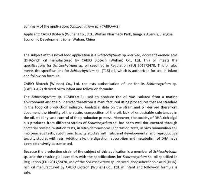 在嘉必优DHA藻油通过了EFSA的安全性评价后,目前欧洲食品安全局对CABIO-A-2的安全评价意见及菌株CABIO-A-2)作为一种新型食品用于婴幼儿和后续配方奶粉(根据欧盟法规)全文已经刊登在欧洲食品安全局期刊上。[3]