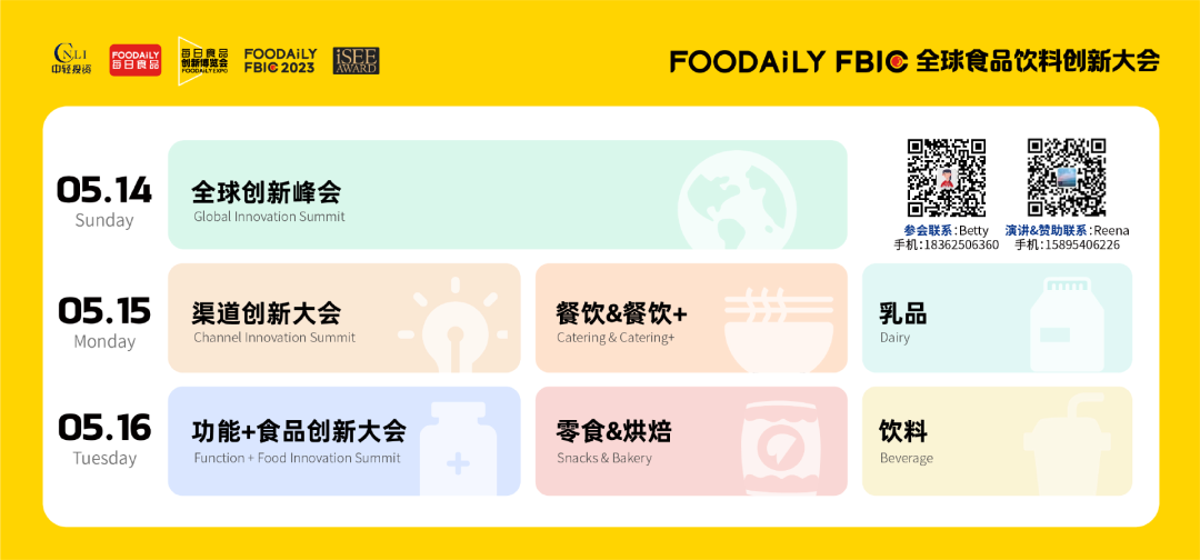 「Foodaily FBIC大会」将以“品牌生态化”为核心,围绕“年轻化能力、数字化能力、品牌化能力、专业化能力”,着眼品牌从0到1,从B到C的开放式思维,打造链接创新与行业发展的新场域。除了传统的全球创新峰会、品类论坛外,特别策划了渠道创新大会、功能+食品创新大会。论坛将邀约150+分享嘉宾,以创新视角共话食品产业新未来。