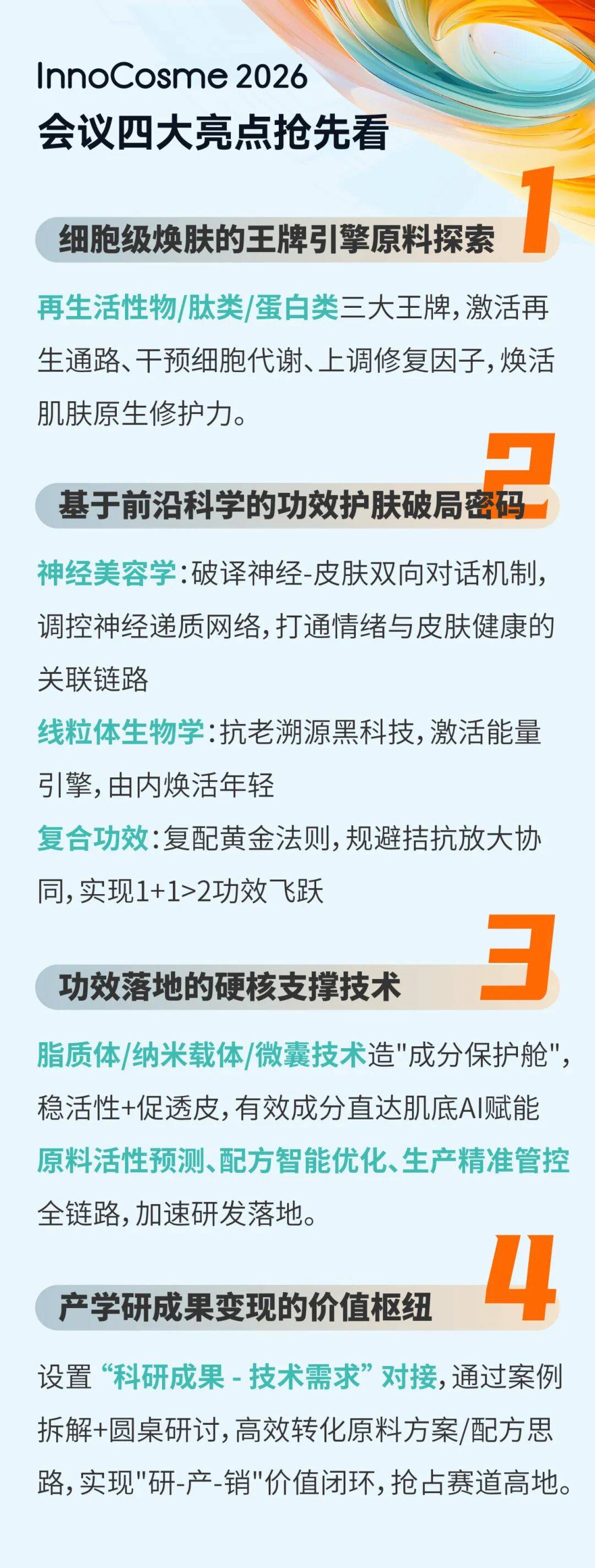 本届会议以 “科技破界 细胞赋能” 为主题,构建多维度论坛矩阵:聚焦再生活性物、肽类、蛋白类等功效原料对细胞再生的驱动作用,围绕细胞再生、神经美容学、复合功效、妆械联合、递送以及AI赋能配方开发等热点话题做深入探讨。力邀80+科研、品牌、临床重磅演讲嘉宾,60+赞助伙伴列席,2500+专业行业同仁与会,旨在构建一场行业盛宴!