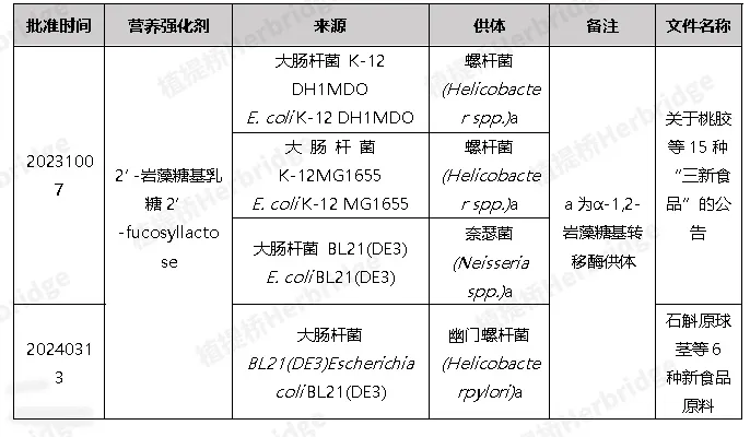 2023年10月7日,《关于桃胶等15种“三新食品”的公告》,和2024年03月13日的《石斛原球茎等6 种新食品原料》2次公告文件中,都有用于生产 2’-岩藻糖基乳糖的生产菌信息,汇总如下表: