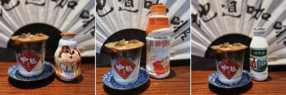 他用娃哈哈的多款产品做测试后发现,营养快线本身有苹果风味,适合做果咖;AD钙奶做拿铁或者Dirty,要复配一些厚乳、冰博克来增加醇厚感。