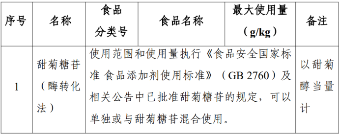 该物质的质量规格要求按照国家卫生健康委员会2024年第 2 号公告执行,《关于石斛原球茎等23种“三新食品”的公告》,[附录 A 用于生产甜菊糖苷(酶转化法)的生产菌信息除外],该食品添加剂新品种的生产菌信息见上表。