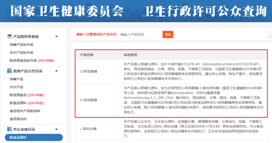 新增2种D-阿洛酮糖,与已获批新原料“实质等同”;虽生产工艺存在差异,但均与2025年第4号公告批准为新食品原料的D-阿洛酮糖具有“实质等同性”,所以顺利进入终止审查名单。