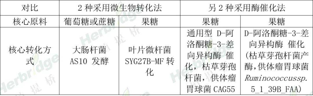 对比这4种不同工艺生产的D-阿洛酮糖,差异点主要表现在核心原料和生物转化方式不同。