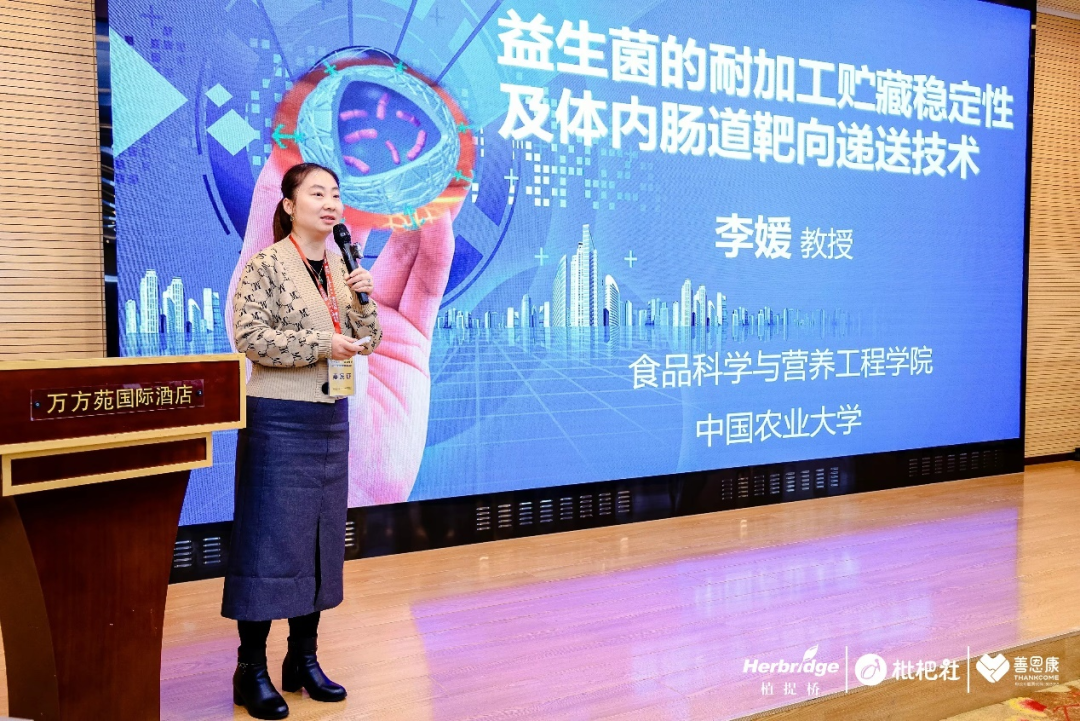 益生菌的稳定性一直都是产业界面临的问题,中国农业大学食品科学与营养工程学院教授、博导李媛分享了“益生菌耐加工贮藏稳定性及体内肠道靶向递送技术”相关内容,包括益生菌的包埋、稳态化工艺、递送微球等相关技术工艺。